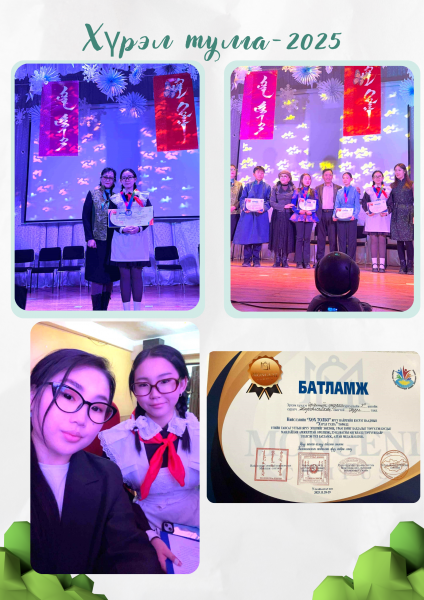 Нийслэлийн ЕБ сургуулиудын дунд зохион байгуулсан "Хүрэл тулга-2025" яруу найргийн уралдааны дунд насны ангилалд 9-3 ангийн сурагч Ж.Туул "Тэргүүн байр" алтан медаль хүртэж улсад орох эрхээр шагнагдлаа.Бэлтгэсэн багш У.Дашдуламдаа болон шавь Ж.Туулд нь баяр хүргэж удахгүй болох улсын уралдаандаа улам их амжилттай оролцохыг хүсэн ерөөе!